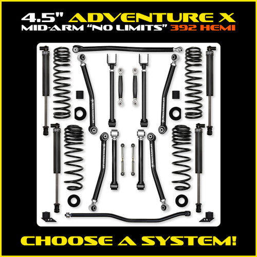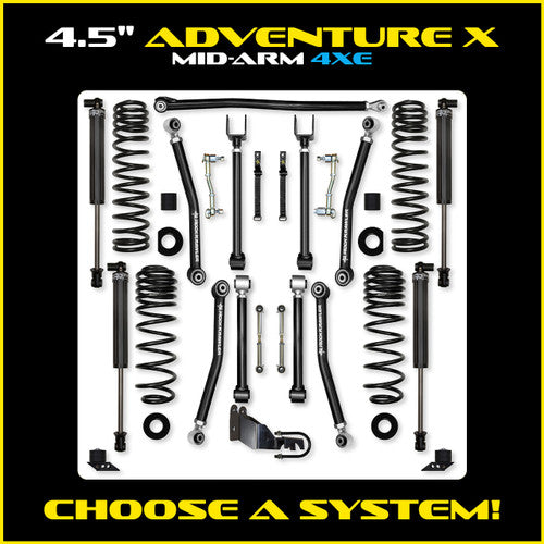 The Rock Krawler 3.5" Adventure - X "No-Limits" Mid-Arm 4XE System is specifically designed for JLU RUBICON owners who want a complete system, bolt-in installation, and the best articulation of any MID-ARM kit on the market. Our system proves its durability and off-road performance every time you hits the streets or trail! The Term, "No-Limits" comes from the inclusion of our front sway bar links specifically designed for use with the factory electronic sway bar disconnect feature found standard in your Rubicon Wrangler! The sway bar links themselves come with factory sized hardware, a CNC machined billet aluminum center section, and Made in USA heim joints from FK bearing, once installed, just press the button and hit the rocks! The Term, Adventure - X comes from the inclusion of 8 adjustable control arms with our 100% Service Free Adventure Series joints installed. Our industry leading, Adventure - X mid-Arms feature adjustable upper and lower control arms and offer a total of 70 degrees of misalignment when paired with our Adventure series Joints at the frame connection and at the axle. The inherent bind in a factory JL control arm is greatly reduced. With so much adjustability, it allows you to precision tune the JL's caster and pinion angle front and rear.